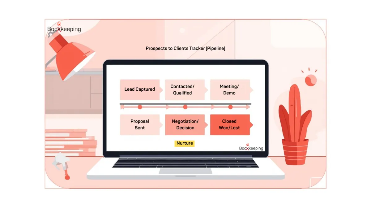 The Free Prospects-to-Clients Tracker, included in the Booqkeeping.com Business Growth Toolkit, gives you a clear, visual way to manage every lead from first contact to paying customer.